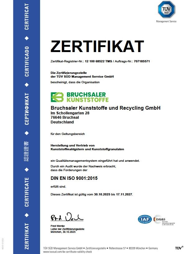 Die Bruchsaler Kunststoffe und Recycling GmbH ist nach ISO 9001 und ISO 14001 zertifiziert.